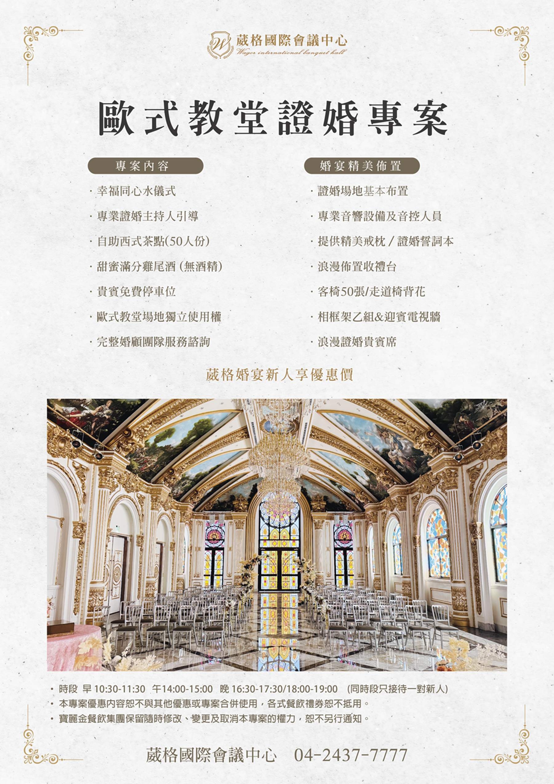 歐洲皇室等級的古典婚禮 | 2024-2025葳格教堂證婚專案